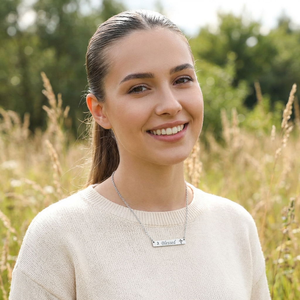This engraved cutout cross bar necklace feels like a quiet promise you carry against your skin. The slim horizontal bar, gently pierced with a cross, sits low and confident—an intimate daily reminder that you are blessed. Its smooth edges and polished face catch soft light without shouting. Wear it alone for a subtle faith statement, or layer it with textured chains for a lived-in look that grows with you. Thoughtful and restrained, it slips into mornings with coffee and evenings of grateful reflection, or accompanies milestone moments like graduations and anniversaries with steady, understated presence.