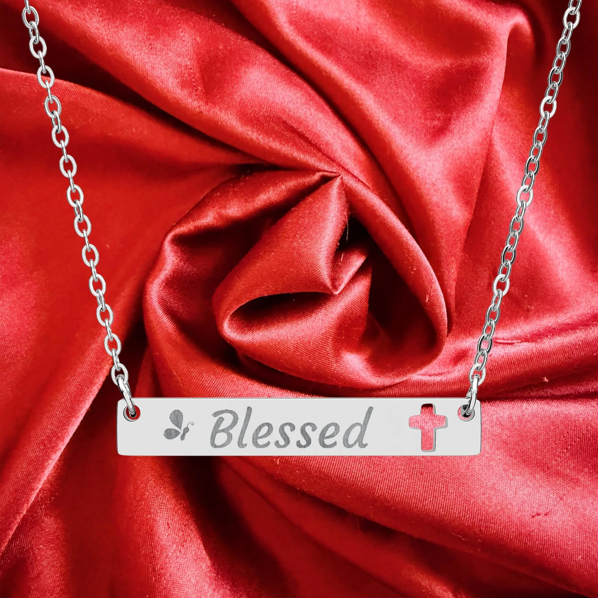 Blessed Cutout Cross Bar Necklace — Engraved Faith Pendant (Blessed)