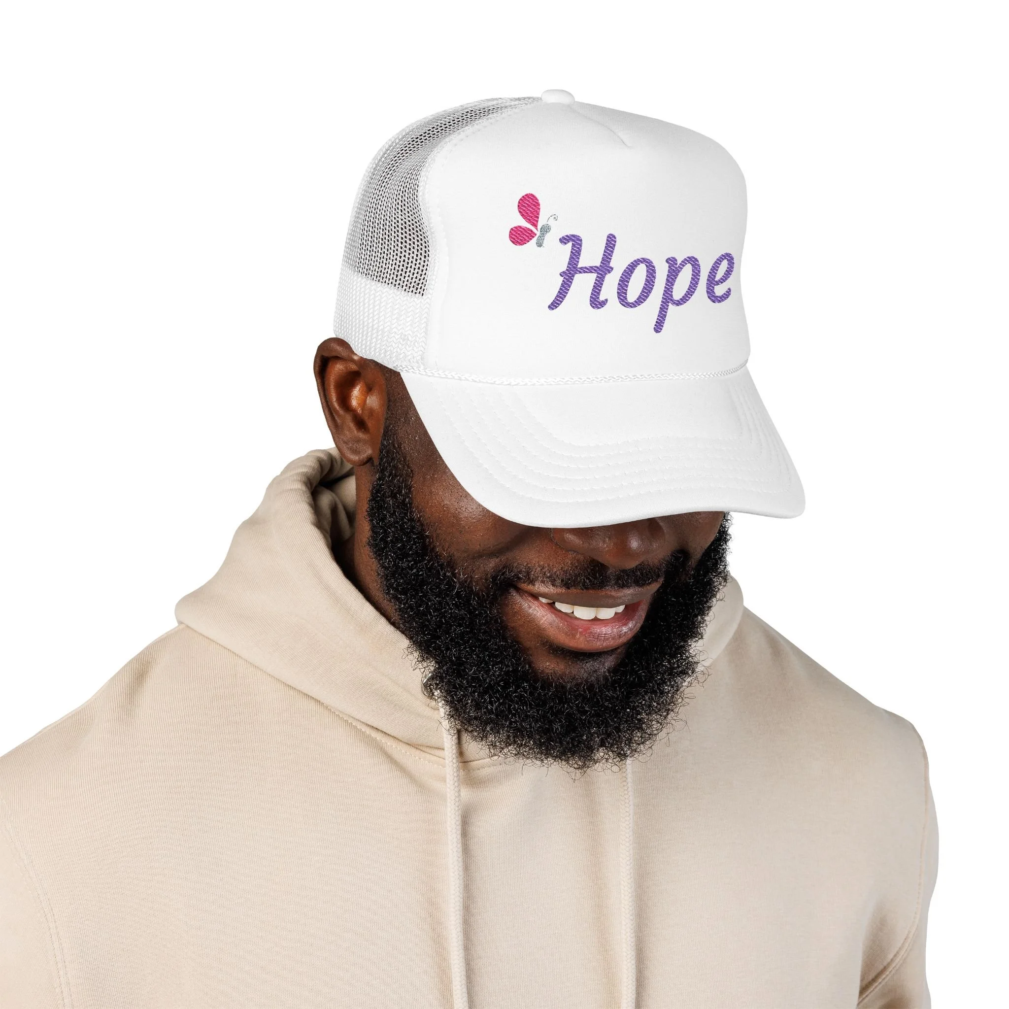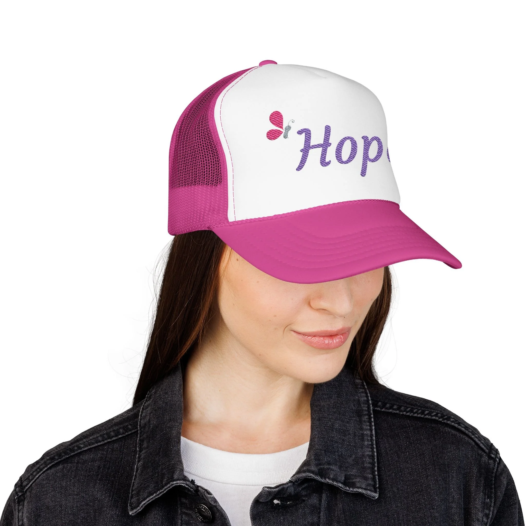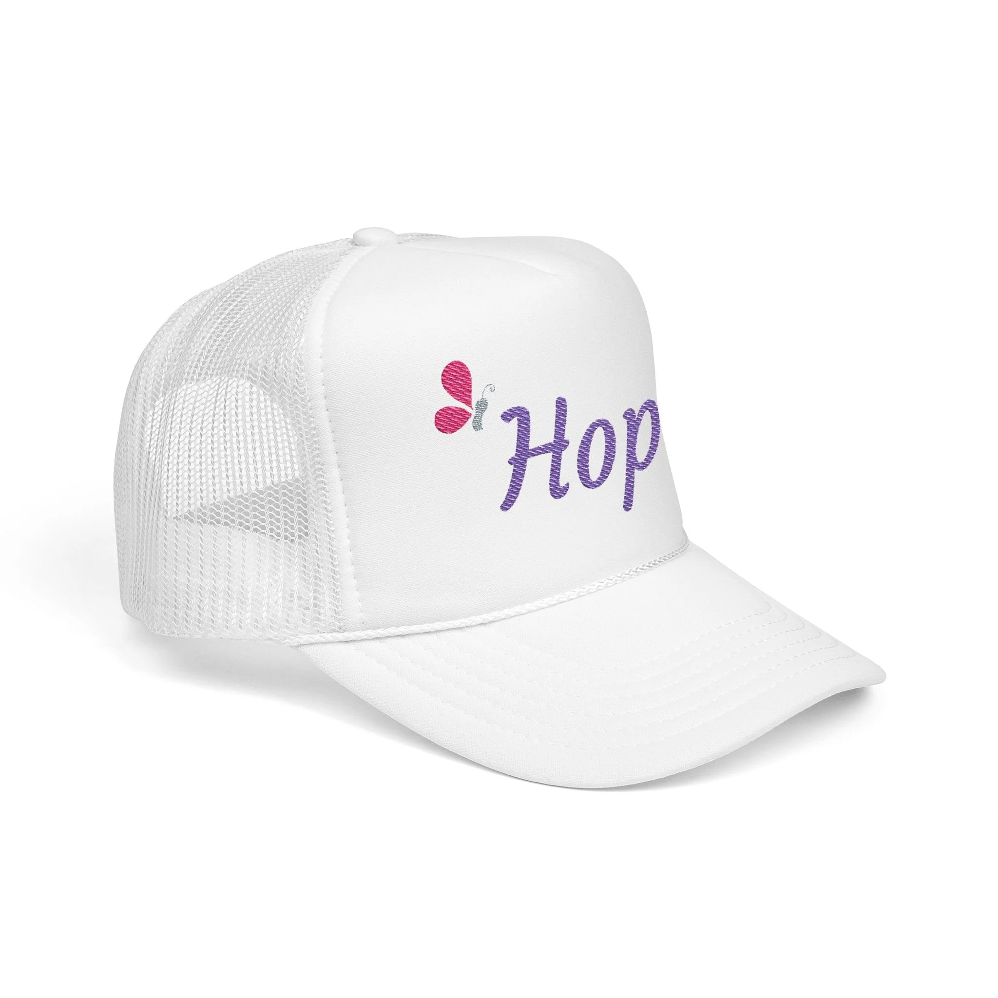 - Seamless foam front with embroidered lavender "hope" and pink butterfly