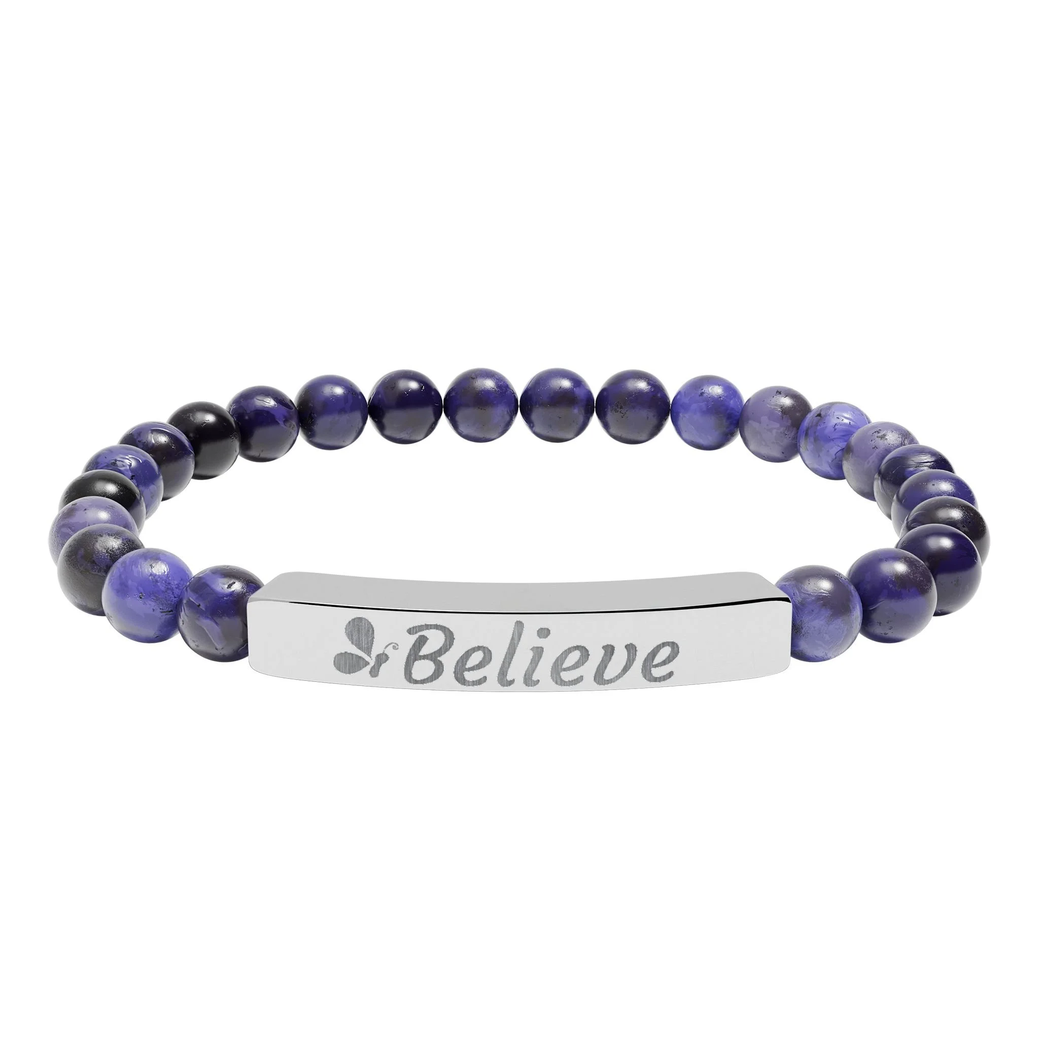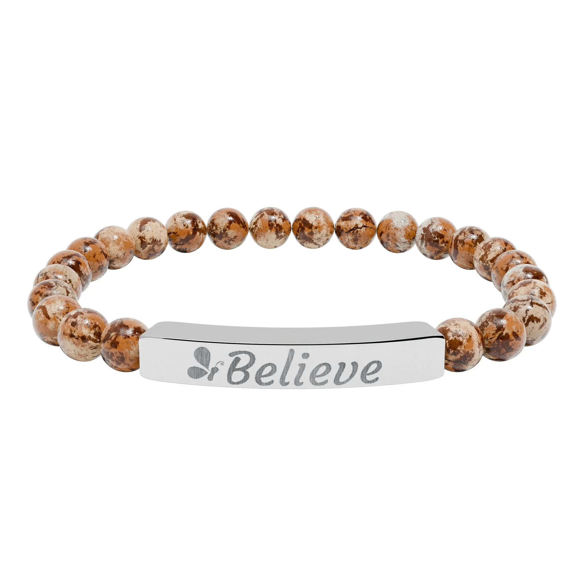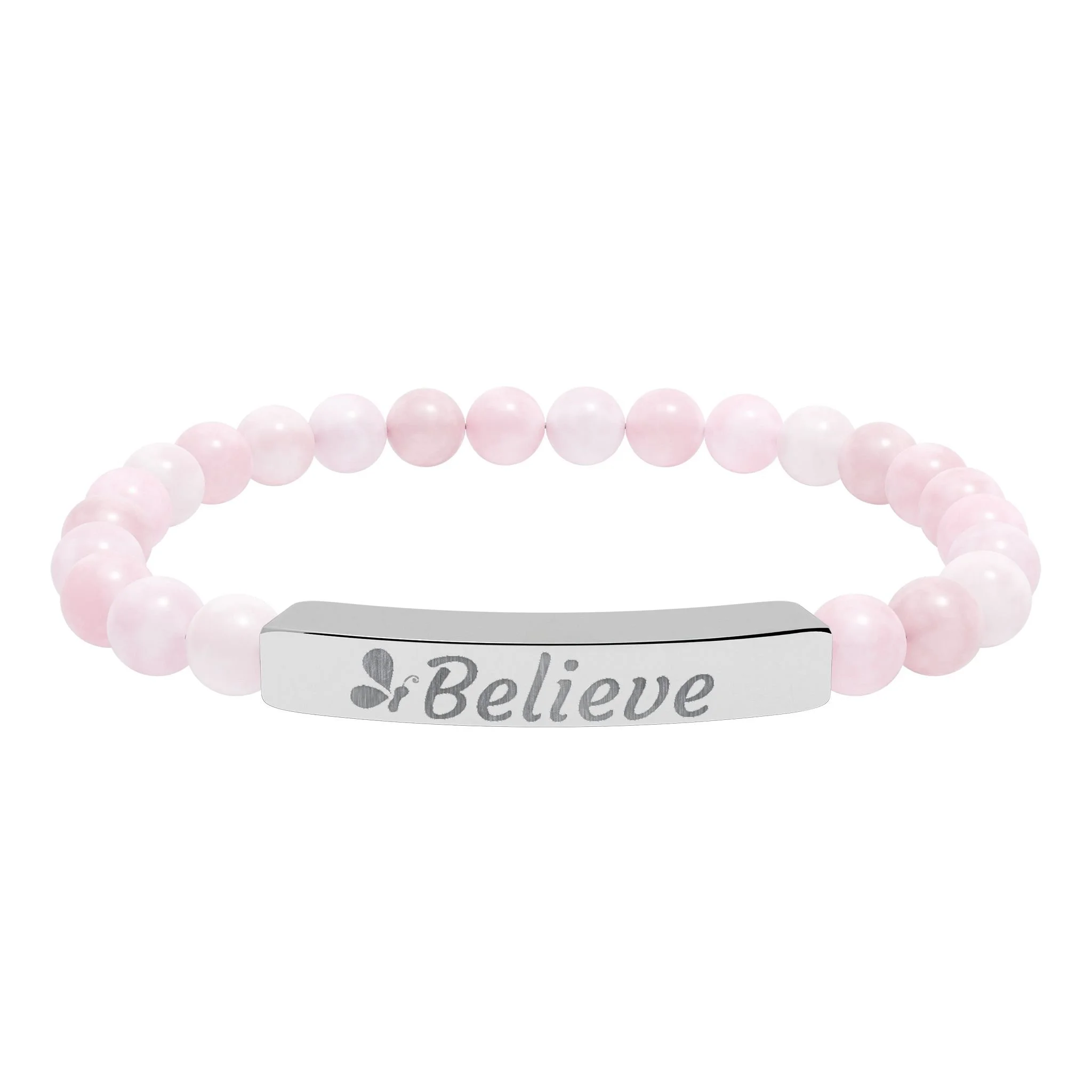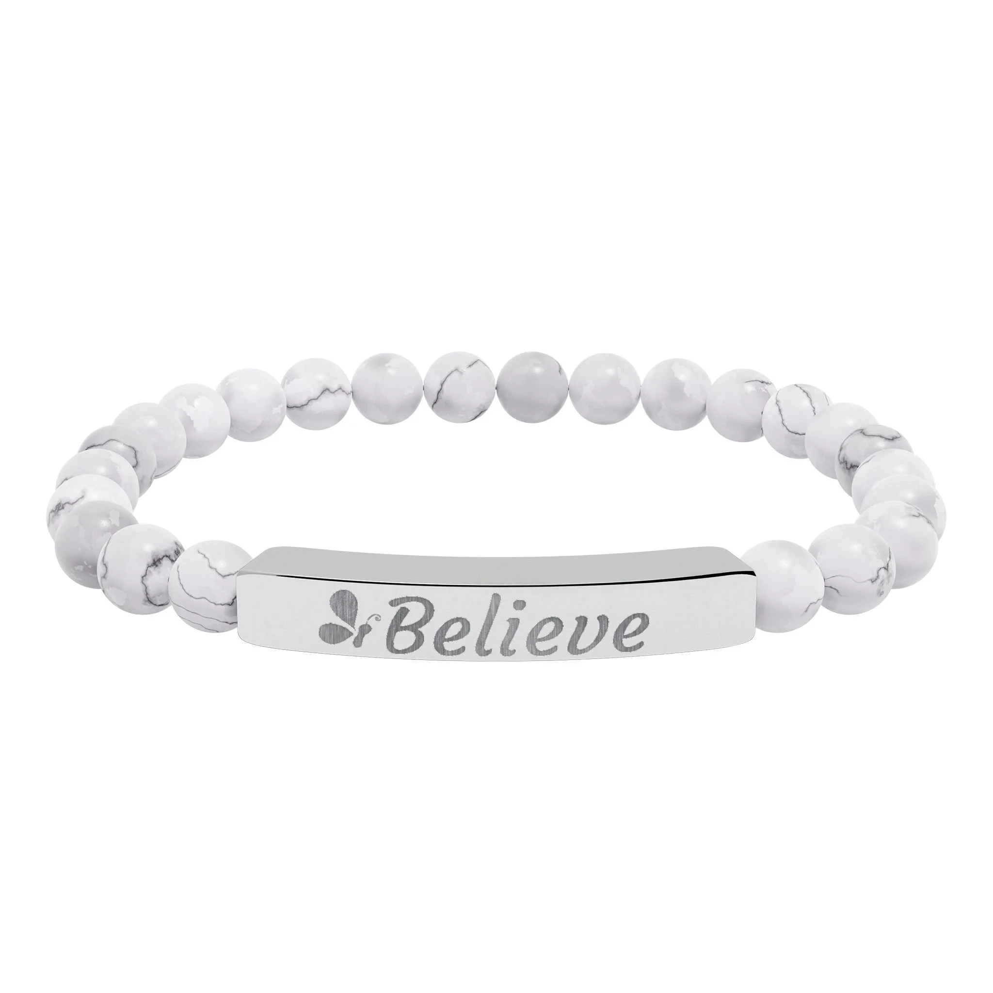 A serene stretch bracelet crafted from polished natural stone beads and a sleek engraved stainless steel bar. Each bead shows soft, calming hues—gentle pastels or marbled white—strung on a flexible cord for easy wear. The engraved bar reads “Believe”, giving the piece a quiet, uplifting presence. Lightweight and durable, it slips into everyday life: tucked beneath a sweater cuff during slow mornings, stacked with other favorites at a café table, or worn as a low-key talisman on days you need a little reminder. Arrives in a white gloss jewelry box with non-tarnish cotton fiber for protection and gifting-ready presentation.