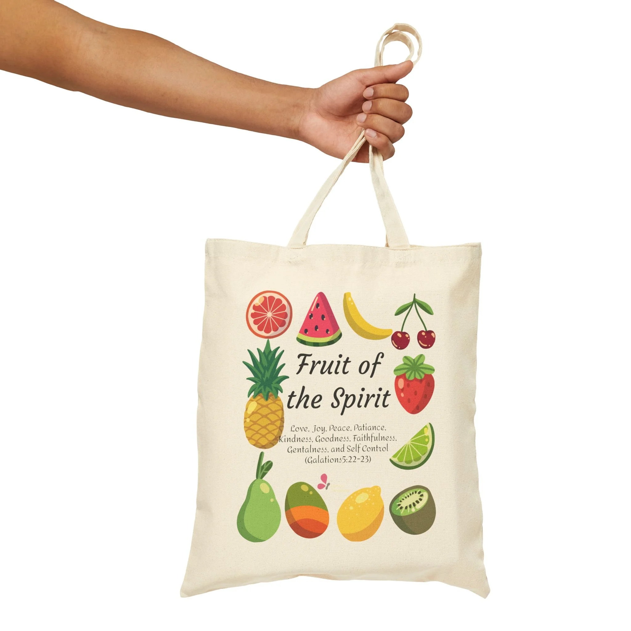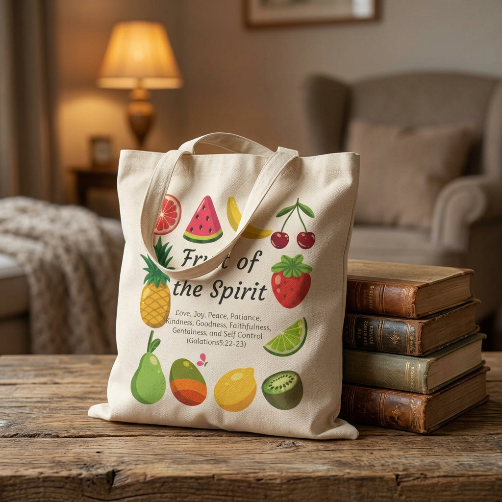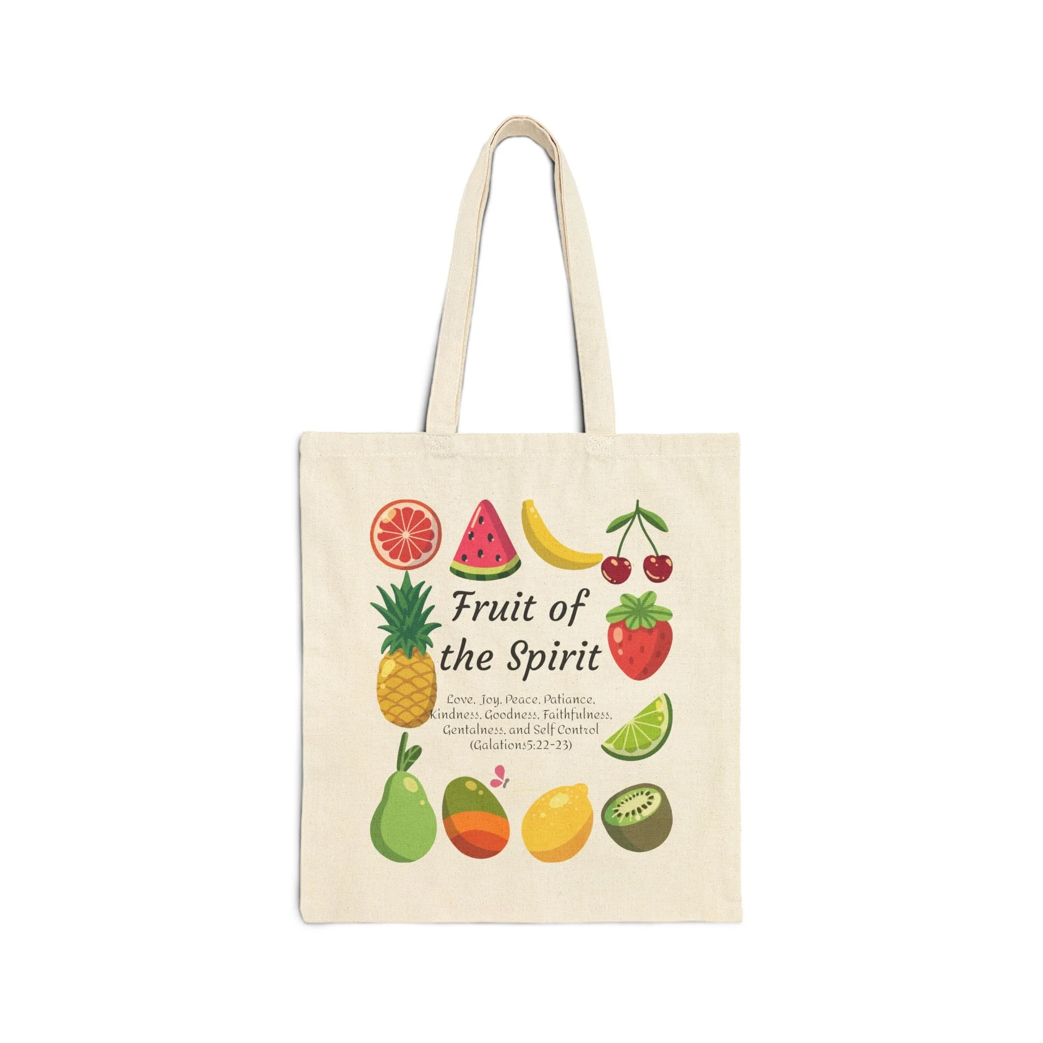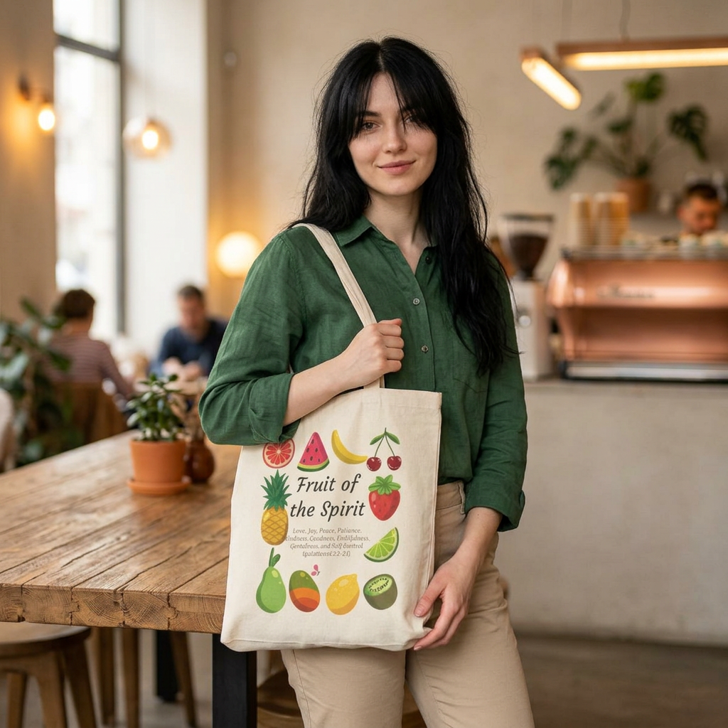 Carry a little joy wherever you go with this sturdy cotton canvas tote featuring a playful ‘Fruit of the Spirit’ design. Bright, hand-drawn fruit icons circle warm, handwritten lettering that reads like a gentle reminder—gentle, rooted, and hopeful. The heavy-weight canvas holds its shape and feels substantial in hand, while the flat, boxless profile keeps the look clean and minimalist. Wear it to church group meetings, farmers’ markets, or weekly errands — it blends function with a quiet, uplifting message you’ll enjoy seeing everyday.