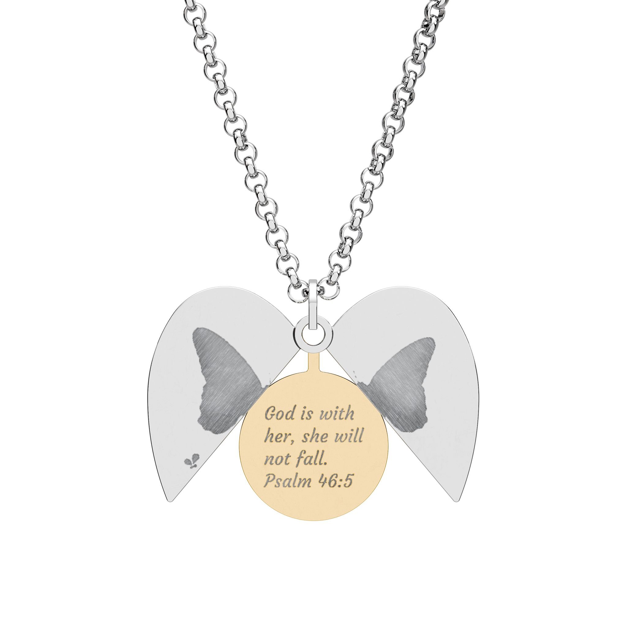 This delicate butterfly-heart necklace carries a tiny, private promise: Psalm 46:5 engraved inside a hidden circle so faith can rest close to the chest. The pendant combines a graceful butterfly silhouette with a subtle heart, its inner message revealed only when you look — a quiet ritual of remembering that God is with her. Lightweight and durable, the polished stainless steel and warm 18K gold PVD finish catch the light without demanding attention. Wear it layered with everyday jewelry or let it stand alone on moments when you need a soft reminder of strength. Gift it to a loved one after a meaningful milestone, tuck it into an Easter package, or slip it into a birthday or anniversary note as a private blessing.
